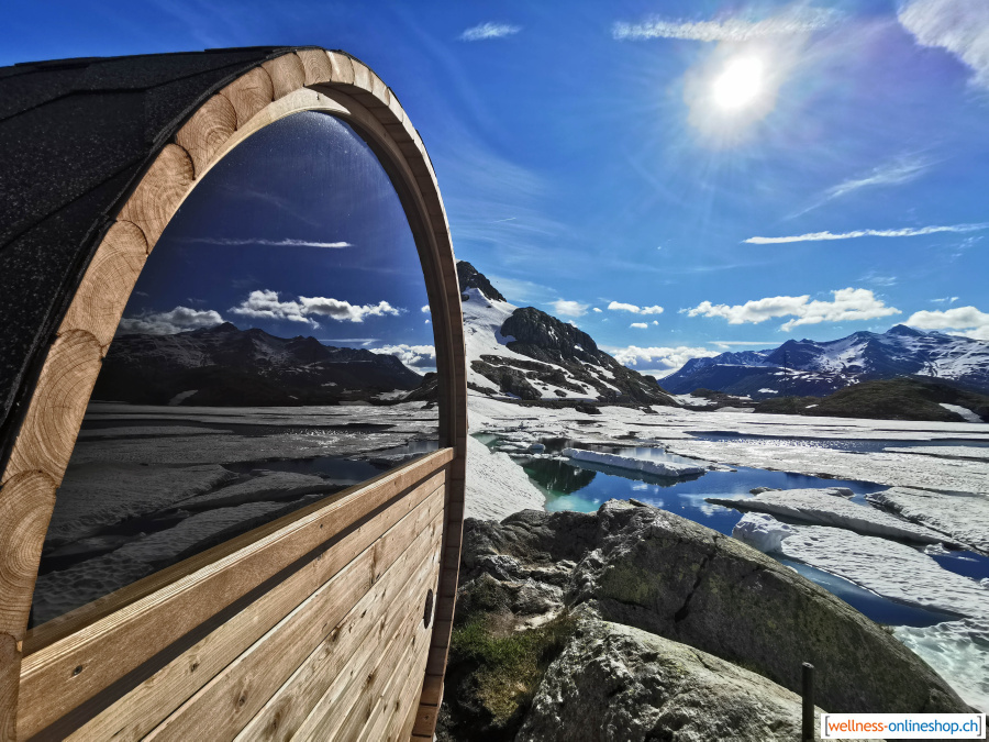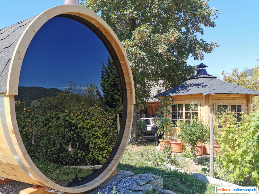 Fasssauna aus Schweizer Arve mit Spiegelglas