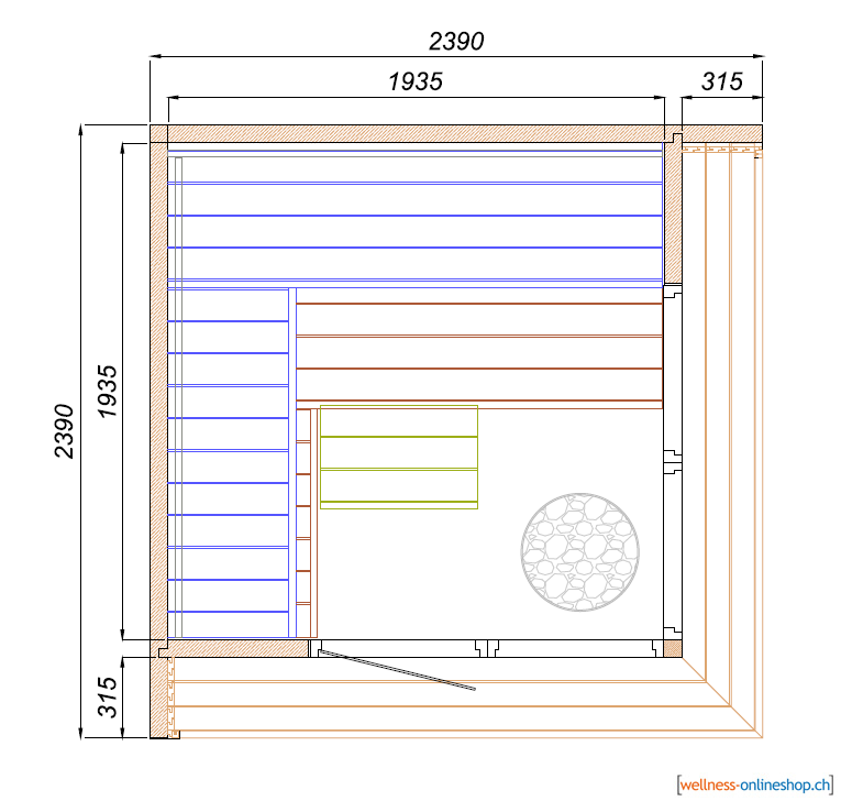 Der Innenraum der Sauna ist in einer luxuriösen Ausstattung, mit Holzofen oder einem Elektrofen für die Sauna.möglich.
