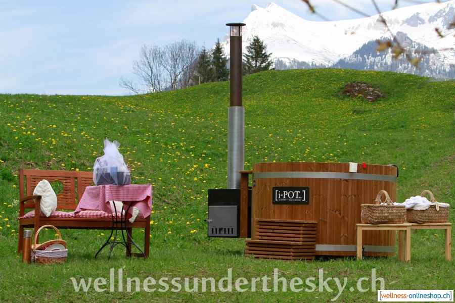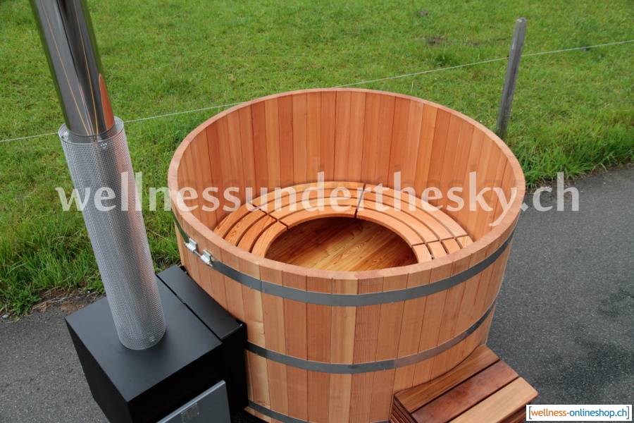 Der Lärchen-Hotpot in Schreiner-Qualität mit Innenofen aus Marine-Aluminium für 4 bis 6 Badegäste