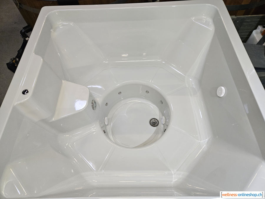 Die Pumpe ist an eine Wanddurchführung angeschlossen. Sobald die Wanddurchführung eingetaucht ist, kann das Wasser erhitzt werden. Das bedeutet, dass der Hotpot schon fast warm ist, bevor Sie ihn fertig befüllt haben, wenn man den durchschnittlichen Wasserdruck eines Wasserhahns annimmt. Ideal also.