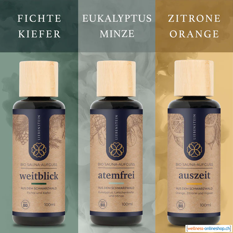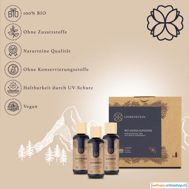 Unser Aufguss Sauna Set enthält 3 BIO Sauna Aufgüsse mit 100% naturreinen ätherischen Ölen aus kontrolliert biologischem Anbau. In jedem Sauna Aufguss finden nur die feinsten Rohstoffe Ihren auserwählten Platz. Für eine bestmögliche Qualität in jeder Note, jeder Nuance und in jedem Moment
