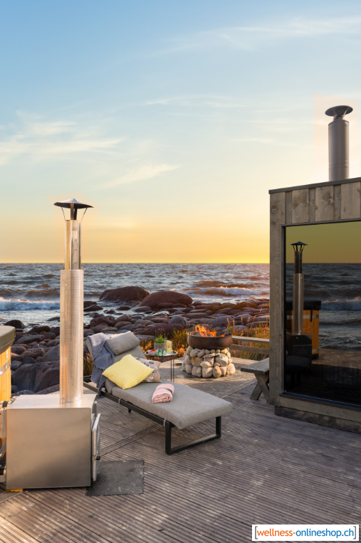 Das Äussere der Sauna ist aus rustikalem, grau behandeltem finnischen Nadelholz gefertigt. Die lebendige Optik der Aussenverkleidung entsteht durch die ineinander greifenden, zugesägten Bretter. Die Innenflächen der Sauna bestehen aus dunkelgrauem, behandeltem finnischen Nadelholz. Die angenehm schummrige Atmosphäre der Sauna entspannt die Muskeln der Saunierenden und lädt dazu ein, die Gedanken während der Aufgüsse einfach mal schweifen zu lassen.