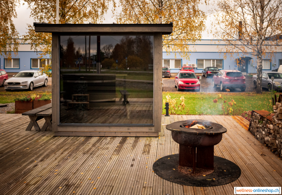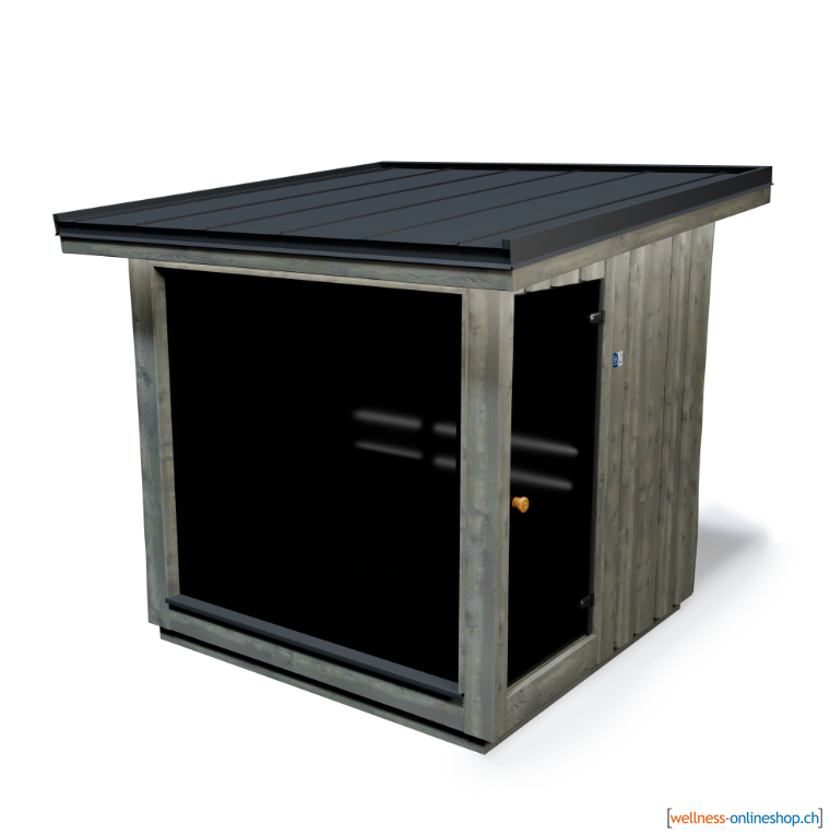 Das Äussere der Sauna ist aus rustikalem, grau behandeltem finnischen Nadelholz gefertigt. Die lebendige Optik der Aussenverkleidung entsteht durch die ineinander greifenden, zugesägten Bretter. Die Innenflächen der Sauna bestehen aus dunkelgrauem, behandeltem finnischen Nadelholz. Die angenehm schummrige Atmosphäre der Sauna entspannt die Muskeln der Saunierenden und lädt dazu ein, die Gedanken während der Aufgüsse einfach mal schweifen zu lassen.