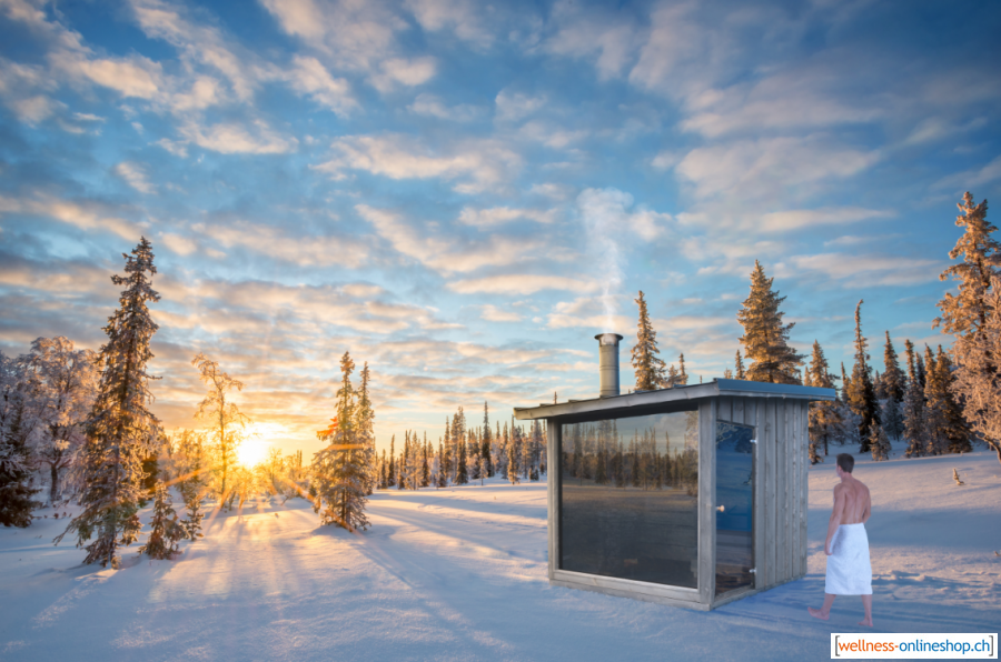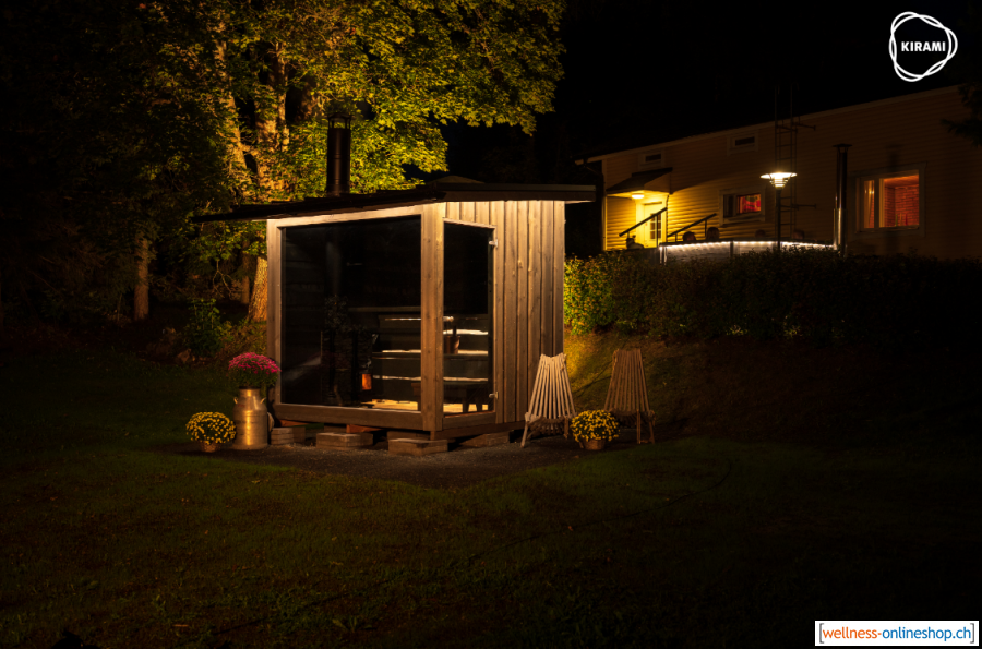 Die Kirami FinVision -sauna ist ein Musterbeispiel für das Ergebnis qualitativ hochwertiger Handwerksarbeit. Die fertig oberflächenbehandelte Sauna wird aus zugesägtem Nadelholz und Fichtenfurnierholz gefertigt. Im Inneren der Sauna herrscht eine gemütliche Atmosphäre, die jeden Entspannungssuchenden in ihren Bann zieht. Dank der grossen Glasflächen kommt auch die Natur ganz nah an Sie heran.Die Sauna ist geräumig, aber dennoch kompakt in der Grösse. Sie hat eine Grundfläche von 5,3 Quadratmetern und eine Höhe von etwas mehr als 2,6 Metern. Die Sauna ist für 4-6 Personen ausgelegt und damit ideal für kleine und grosse Gruppen.Die hellgrauen Bänke und die dunklen Innenwände bilden einen schönen Kontrast zueinander. Die Saunabänke können zur Reinigung und Pflege leicht herausgehoben werden. Die LED-Beleuchtung unter den Bänken trägt zur stimmungsvollen Atmosphäre der Sauna bei.Das grosse Fenster verleiht der Sauna ein Gefühl von Grosszügigkeit und Weite. Es handelt sich dabei um rauchgraues, gehärtetes Thermoglas, das die Energieeffizienz der Sauna verbessert. Die im Stil des Fensters getönte Glastür ist mit einem Magnetverschluss ausgestattet, der ein leichtgängiges Öffnen und Schliessen der Tür ermöglicht und diese fest verschliesst. Der runde Griff ist aus Thujaholz gefertigt und trägt das Kirami-Logo. Die Tür befindet sich standardmässig auf der rechten Seite der Sauna und öffnet rechtsseitig. Die Tür kann auch spiegelbildlich auf die linke Seite der Sauna gewechselt werden mit einer entsprechend linksseitigen Öffnung. Diese Sonderwünsche müssen bei der Bestellung der Sauna gesondert angegeben werden.
