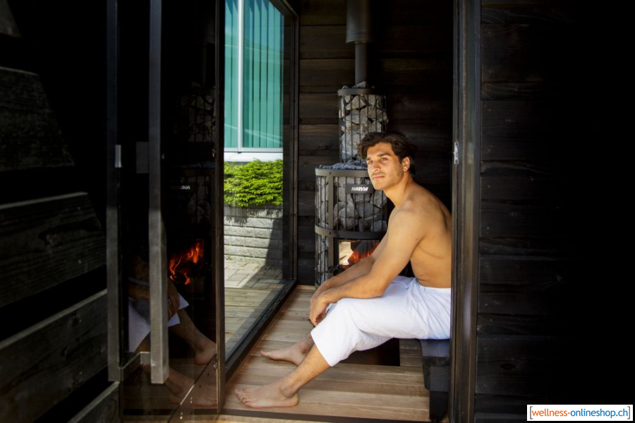 Die Sauna Legend respektiert alte finnische Traditionen und beinhaltet alle Elemente, die das Erhitzen in der Sauna entspannend und magisch machen. Das dunkle Innere der Sauna schafft eine gemütliche Atmosphäre, in der Sie die Stille und Wärme geniessen können. Das grosse Panoramafenster ermöglicht es die Aussicht zu geniessen, während Sie sich in der Sauna aufwärmen.