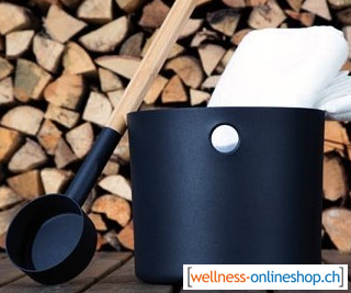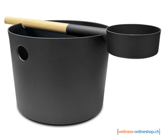 Stilvolles Aufguss-Set bestehend aus Kübel (Alu) und passender Kelle (Bambus/Alu). Die Beiden sind unzertrennlich, denn die Kelle fungiert auch als Tragegriff.