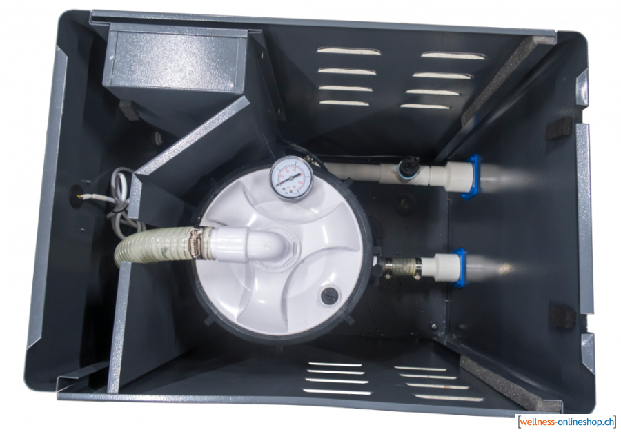 - Filterkiste ist mit Wasserablauf und Kabeldurchführungen versehen, wodurch das Kabel in den Schaltkasten geführt werden soll.