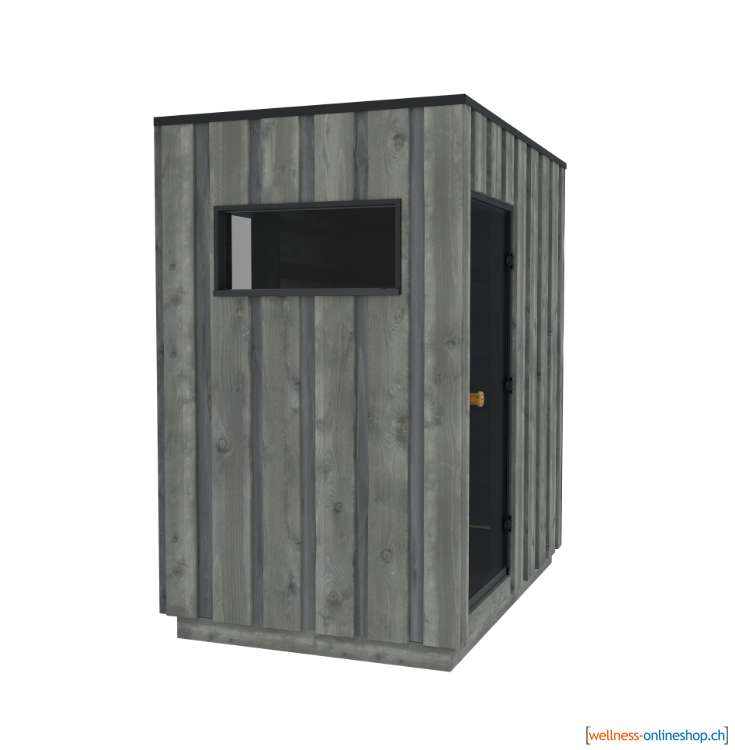 Wir haben das Dach der Original -Umkleidekabine im Frühjahr 2022 rekonstruiert, wodurch die Umkleidekabine komplett montiert geliefert wird. Eine Bank, eine Garderobe und eine LED-Beleuchtung für die Garderobe können als Zubehör für die Umkleidekabine erworben werden, die mit einem Fenster und einer Glastür ausgestattet ist, um Licht hereinzulassen. Die rauchgraue Glastür mit grau Holzrahmen schafft in der Umkleidekabine der Kirami FinVision -Sauna eine stimmungsvolle Atmosphäre und ein Gefühl von Weite, und sie hat die gleiche Grösse wie die Tür zum Saunaraum. Alle Glasflächen in der FinVision -Sauna und im Umkleideraum haben den selben Farbton.