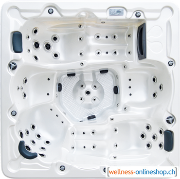 Der Whirlpool Spiez ist ein luxuriöser Pool, der Platz für bis zu 5 Personen bietet. Er ist mit 3 Sitzflächen und 2 Liegeplätzen ausgestattet und verfügt über eine Vielzahl von Sprühdüsen, einschliesslich eines integrierten Wasserschwalles, der eine entspannende Massage bietet. Ein separater Filtereinsatz sorgt dafür, dass das Wasser sauber bleibt, während die robuste Isolierung die Wassertemperatur aufrecht erhält. Hier bekommen Sie die Entspannung die Sie Sich verdient haben!