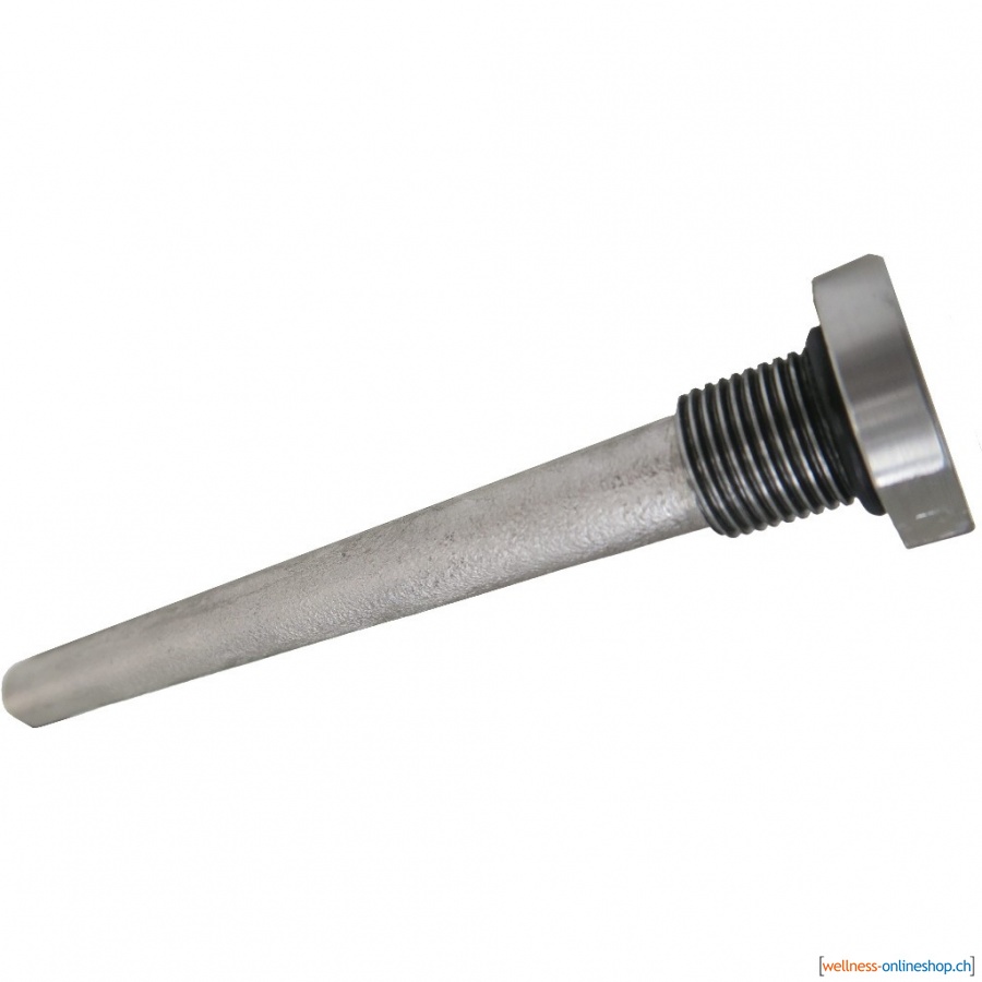Die neue Magnesium Opferanode für alle Kirami Badefass-Aussenöfen mit Anodenhalterung. Durch den Einsatz der Magnesium Anode wird der Ofen noch besser vor Korrosion durch Chemikalien geschützt. Einzigartig auf dem Markt der Badefässer ist der Einsatz dieser Magnesium Opferanode. Jeder Ofen, egal ob Aluminium oder Edelstahl wird durch den Einsatz von Chemikalien wie Chlor angegriffen. Die Anode wird eingesetzt, um die Lebensdauer der Öfen deutlich zu verlängern. Die Magnesium Anode sollte ca. alle 12 Monate ausgetauscht werden, da dann das Magnesium verbraucht ist und die Wirkung der Opferanode nicht mehr aufrechterhalten wird.