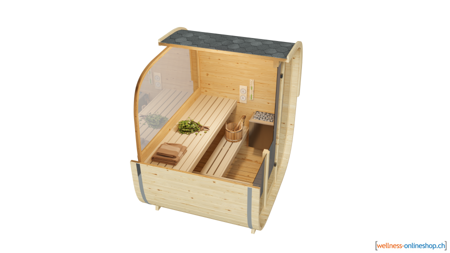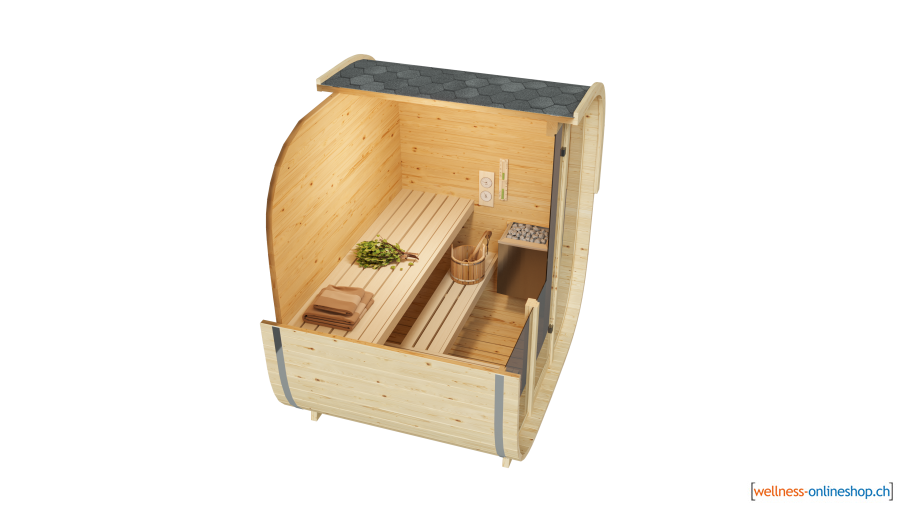 Mit einem Holzofen oder einem elektrischen Saunaofen heizen Sie die kleine, kompakte Sauna in kurzer Zeit auf die perfekte Saunatemperatur.