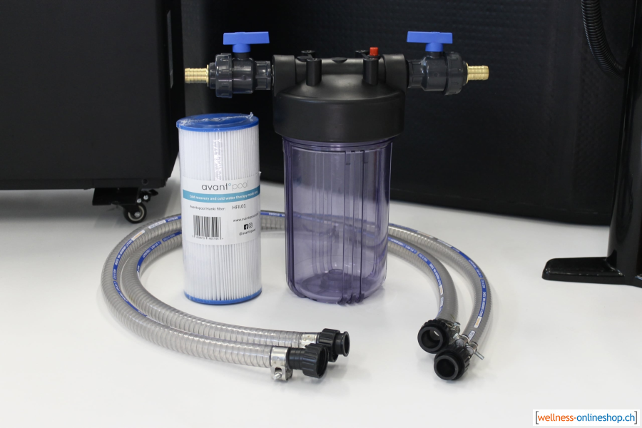 Das optionale Filterpaket (geeignet für Avantopool Hanki und Avantopool Kide) schützt die Kühl-/Heizeinheit vor Schmutzpartikeln und hält diese vom Wasserkreislauf fern. Das Filtergehäuse wird mit vormontierten Schläuchen und Schnellkupplungen sowie zwei Kugelhähnen geliefert. Das Filterpaket enthält ausserdem einen Filter im Gehäuse und 2 zusätzliche Filter. Die Filter müssen mindestens einmal pro Woche gereinigt werden. Verschmutzte Filter beeinträchtigen den Wasserdurchfluss. Wenn Sie den Filter regelmäßig reinigen, hält er länger. Wir empfehlen, den Filter alle 1-3 Monate zu wechseln, je nach Nutzung des Pools.