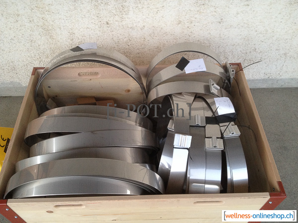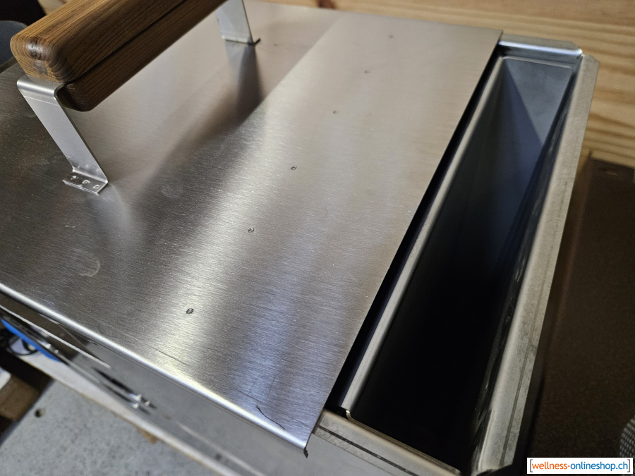 Ofen aus Edelstahl mit vier Laschen an der Seite für Befestigung.Die Befestigung erfolgt innen im Badefass.