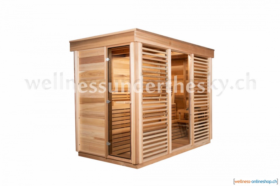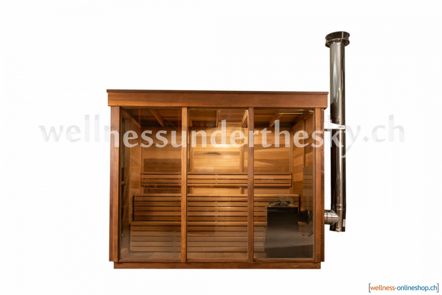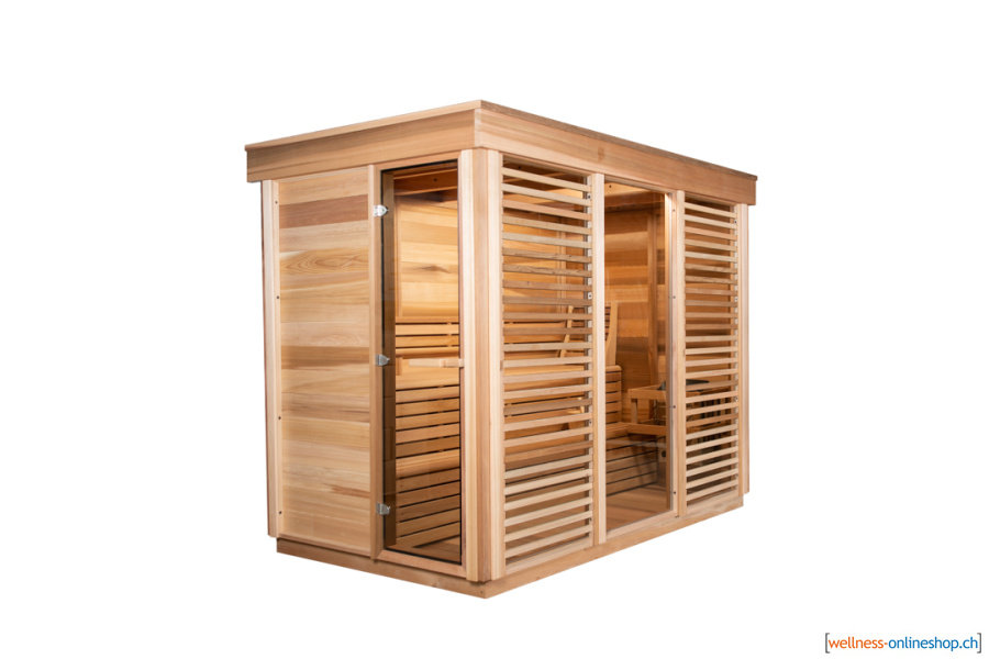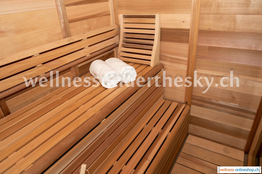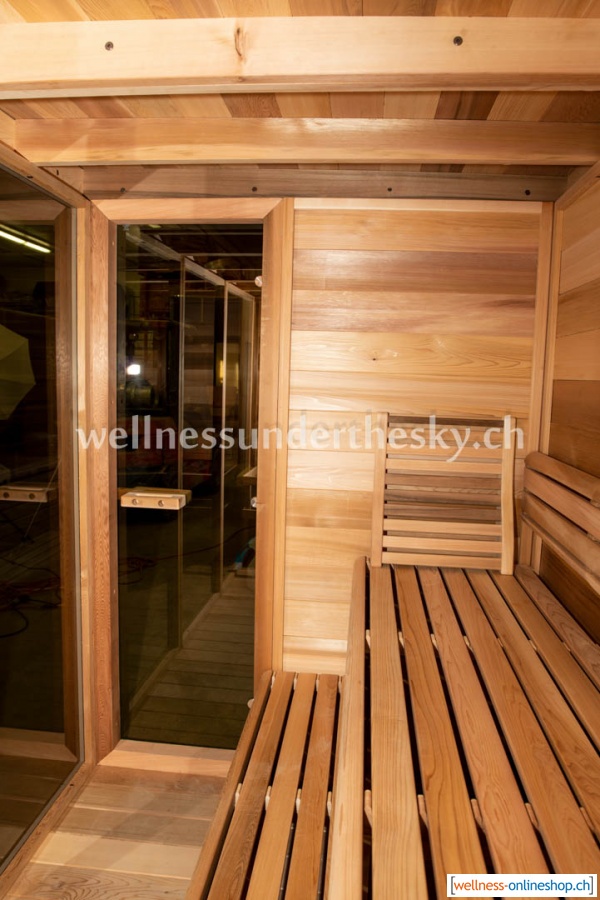 Saunacube aus astfreier kanadischer Roter Zeder mit Panoramafenster