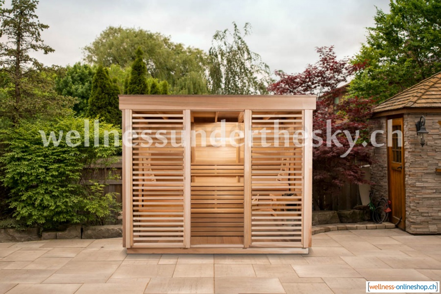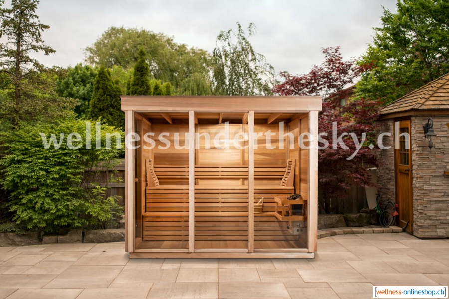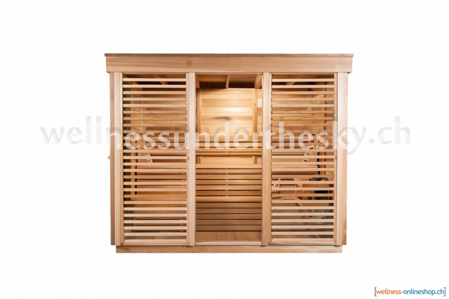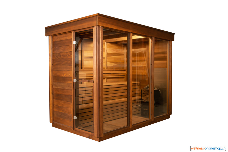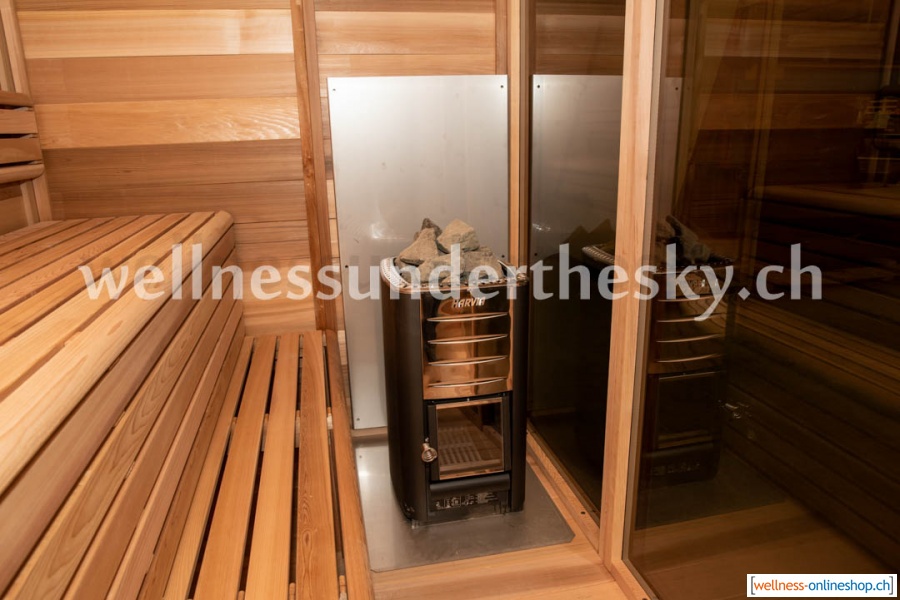 Die grosse Glasfläche mit Sichtschutz-Paneele und der Möglichkeit mit integrierter Dusche aus Red Cedar macht aus Ihrer Sauna etwas Besonderes. Mit den originalen, hochqualitativen Saunasteinen aus Finnland wird ein Aufguss zum besonderen Erlebnis.