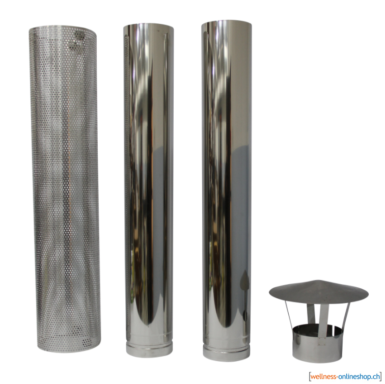 Für die Öfen von Kirami sind Schornsteine aus säurebeständigem Stahl mit einem Durchmesser von 120 mm oder 150 mm erhältlich. Das Schornsteinsortiment umfasst Pakete, Ersatzteile und verschiedene Verlängerungsteile. Mithilfe der geraden Verlängerungsteile lässt sich der Rauch leichter ableiten und stört die Badegäste nicht. Die einstellbaren gebogenen Schornsteinteile für Biegungen zwischen 0-30 oder 0-90 Grad erleichtern Lösungen an schwierigen Stellen, z.B. bei der Ableitung des Schornsteins an einer Überdachung oder in der Nähe der Hauswand. Der Schornstein sollte stets mit einer ordentlichen, aus säurebeständigem Stahl gefertigten Schornsteinhaube, welche die Funken im Zaum hält, abgerundet werden. Ein Hitzeschutz um den Schornstein fördert die Sicherheit und verhindert unnötiges Heizen.