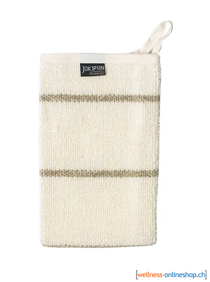 Tolle, beste Qualität von Jokipiin Pellava Haus. Die Finnen kennen die Verarbeitung von Leinen. Seine glatte Oberfläche sorgt für eine Reinigung der Haut, Massierung und Stimulation der oberflächlichen Durchblutung. Ein sanftrauer Leinenfrottierhandschuh, der nach jedem Waschgang noch sanfter wird, empfindliche Haut verwöhnt und eine sehr gute Saugfähigkeit aufweist, wird durch die Verarbeitung von 70% Leinen mit 30% Baumwolle hergestellt. Die Luxus-Klasse der Saunatextilien wird hier erwähnt.