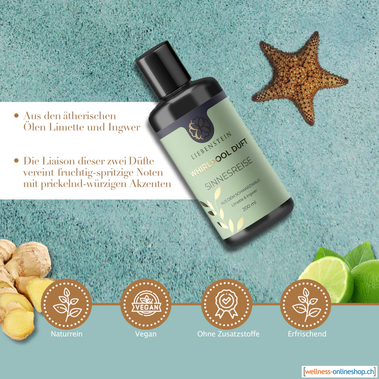 - ? PREMIUM QUALITÄT - DerWhirlpoolduftSinnesreisebesteht aus 100% naturreinen Inhaltsstoffen und vereint angenehm frische Noten von Limette & Ingwer. In diesem Pool Duft finden nur die feinsten Rohstoffe Ihren auserwählten Platz – für eine bestmögliche Qualität in jeder Note, jeder Nuance, in jedem Moment