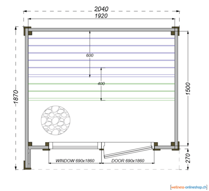 Das Holz des Aussenbereiches sollte abhängig vom Zustand mit einer natürlichen Holzschutzlasur jährlich gestrichen werden. Der Innenraum sollte unbehandelt bleiben oder mit einem speziellen Saunawachs behandelt werden.